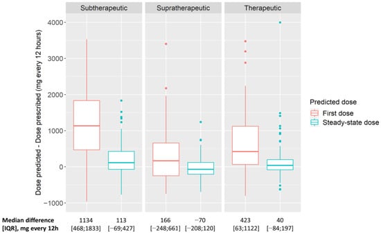 Based on the predictive performance, we selected the MAASSE approach as the model-based approach with the best predictive performance (defined as a combination of the lowest overall rBias and rRMSE). The dose differences were calculated with the doses predicted according to the MAASSE approach. The median differences between the second (i.e., steady-state) model-predicted dose q12h and the prescribed (i.e., standard TDM-based) dose q12h were 113 [−69; 427] mg, −70 [−208; 120] mg, and 40 [−84; 197] mg in the case of subtherapeutic, supratherapeutic, and therapeutic exposure at the time of the second vancomycin concentration, respectively. These differences are depicted in Figure 4, together with the differences between the first model-predicted dose and the prescribed dose. The differences with the first model-predicted dose were substantially larger than that of the second model-predicted dose.