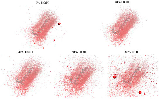 As the concentration of EtOH increases, the distributions of backbone beads of the second peptide molecule around the first peptide molecule become more scattered, showing a more varied pattern of self-interactions with less intense interpeptide interactions. The total interacting surface areas were decreased, and the interaction energies were also reduced as there were fewer beads involved in the dimerisation. This provides an alternative view on why the number of simulations that resulted in different dimer configurations in 0% EtOH, 20% EtOH, 40% EtOH, and 60% EtOH and the calculated plateau value for the interaction energies are less negative as the concentration of EtOH increases. As only around 85% of simulations for 80% EtOH resulted in a dimer configuration, the distributions of the BB beads are more scattered, reflecting those noninteracting simulations.