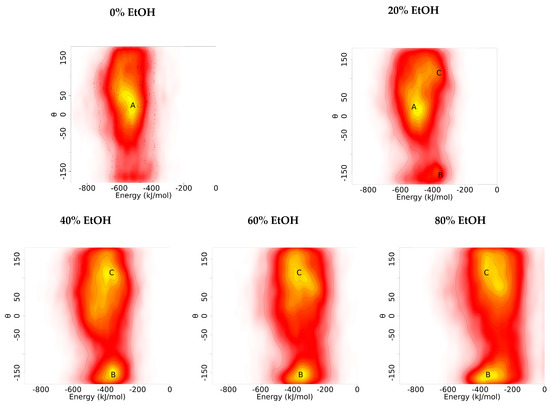 Relative orientations are described as the tilt angle (θ). Population densities are represented by contoured colours, where white to red indicates low densities and yellow represents high densities. Parallel dimers A are predominately found in 0% and 20% EtOH. Antiparallel dimers B and C were found in all conditions containing EtOH.