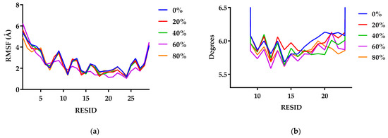 The conformational stability of G48 in different EtOH compositions was analysed by both RMSF and HELANAL based on the final configurations of G48 in each of the 1024 trajectories. The shapes of the RMSF profiles of a backbone residue in the five tested conditions are similar (Figure 5a). In general, the overall mobility of residues within the α-helix core (residues 7–27) in 0% EtOH is slightly larger than that in the EtOH–water mixtures; hence, the intrapeptide motions are greater without EtOH. For the majority of residues, systems with EtOH fluctuate less than the system without EtOH.