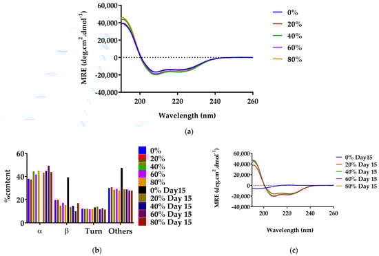 Figure 6b indicates that the inclusion of EtOH in G48 solution led to maintenance in the α-helical conformation at 27 °C even after storage for 15 days. As such, the minima at 208 and 224 nm remained evident. This was observed for all of the aqueous EtOH solutions. There was slightly more reduction in the minimum at 208 nm in 20% EtOH than at other values. Conversely, on day 15 with no EtOH present, there was a shift in minima to 195 nm, which is attributable to the conversion of the initial α-helical conformation to random coils. Additionally, noticeable was a reduction in ellipticity magnitude, which is attributable to the loss in soluble peptide. The proportion of α-helical content in G48 solutions was elucidated from the CD data using BeStSel secondary structure analysis [45].