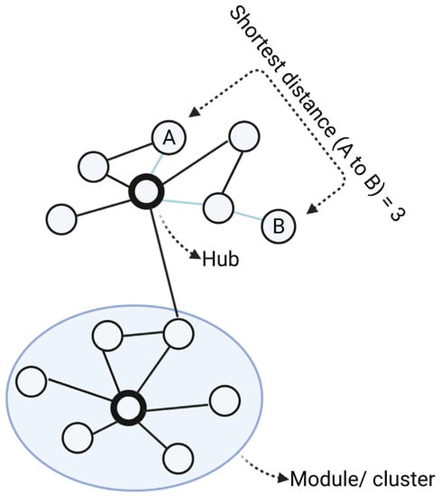 Main elements of a network. In the network, nodes (circles) are connected via edges (lines). For biological networks, nodes are usually biological entities (genes, proteins) and edges denote their relationships (interaction, association, similarity). From the networks, modules are clusters of closely connected nodes. Degree is the number of direct connections a node has to other nodes. Hubs are nodes with the highest degrees in the networks, meaning they have the highest number of connections. The shortest distance between node A and B is the path with the minimum number of edges from A to B. Created with BioRender.com (accessed on 2 June 2022).