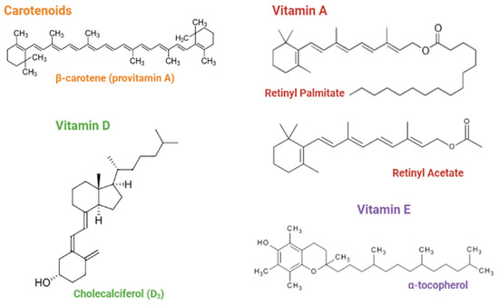 Each micro delivery system was developed and optimized with the following active ingredients: retinyl palmitate (A), β-carotene (B), retinyl acetate (C), cholecalciferol (D), and α-tocopherol (E) (Figure 1).