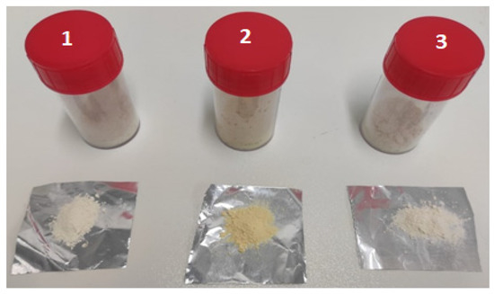 Macroscopic appearance of some microparticle samples obtained from the spray-drying process: 1 (batch A1); 2 (batch B2); 3 (batch C3).