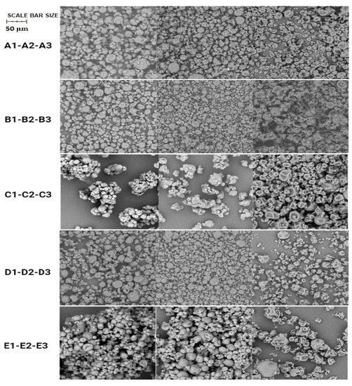SEM images of the microparticle batches: A1 (retinyl palmitate and Eudraguard Biotic), A2 (retinyl palmitate and CAP), A3 (retinyl palmitate and WPs), B1 (β-carotene and Eudraguard Biotic), B2 (β-carotene and CAP), B3 (β-carotene and WPs), C1 (retinyl acetate and Eudraguard Biotic), C2 (retinyl acetate and CAP), C3 (retinyl acetate and WPs), D1 (cholecalciferol and Eudraguard Biotic), D2 (cholecalciferol and CAP), D3 (cholecalciferol and WPs), E1 (α-tocopherol and Eudraguard Biotic), E2 (α-tocopherol and CAP), E3 (α-tocopherol and WPs). Scale bar size 50 μm.