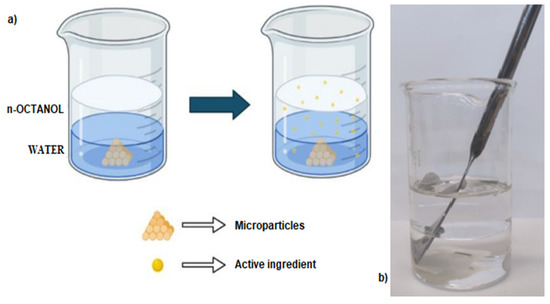 Scheme of the system used for the dissolution/distribution study of the microparticles (created with BioRender.com, accessed on 1 April 2022) (a) and photo of the model used experimentally (b).