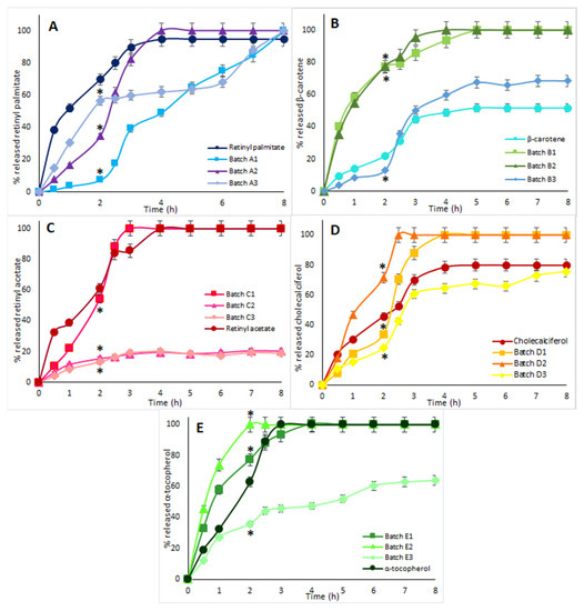 Graphs of the percentage of vitamin released as a function of time: (A) retinyl palmitate, batches A1, A2, A3 and pure retinyl palmitate; (B) β-carotene, batches B1, B2, B3 and pure β-carotene; (C) retinyl acetate, batches C1, C2, C3 and pure retinyl acetate; (D) cholecalciferol, batches D1, D2, D3 and pure cholecalciferol; (E) α-tocopherol, batches E1, E2, E3 and pure α-tocopherol (mean ± SD, n = 3). p < 0.05 (*) for all tested batches versus pure vitamins after 2 h.