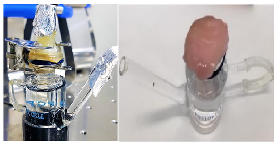 Vertical diffusion of Franz’s cell during the experiment (left panel). Positioning of the porcine intestinal mucosa on the acceptor compartment of Franz’s cell (right panel).