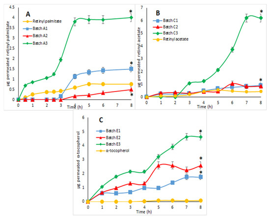Amount (μg) of permeated vitamin as a function of time: (A) retinyl palmitate, batches A1, A2, A3 and pure retinyl palmitate; (B) retinyl acetate, batches C1, C2, C3 and pure retinyl acetate; (C) α-tocopherol, batches E1, E2, E3 and pure α-tocopherol (mean ± SD, n = 3). p < 0.05 (*) for all tested batches versus pure vitamins after 8 h.