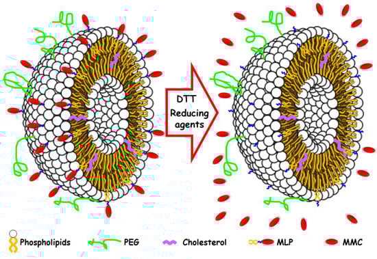 A potential solution for avoiding the toxicity of the free drug is the encapsulation of MMC into different carriers, such as liposomes. This approach could reduce its toxicity and enhance its therapeutic potential if MMC were retained stably in liposomes during circulation [5]. However, MMC was quickly released from those nano-liposomal carriers in physiological fluids, which allows the drug to gain non-selective access to tissues, thereby resulting in similar toxicity effects as the free drug. To solve this, Gabizón et al. proposed the synthesis of a mitomycin C lipidic prodrug (MLP) so that the liposomal entrapment of MMC could be facilitated and the formulation stabilized thanks to the strong association of the prodrug to the liposomal bilayer [6]. From the chemical point of view, the prodrug MLP was composed of the actual drug, MMC, modified through a dithiobenzyl linker with a lipid moiety [7]. The idea was that the prodrug (MLP) could be activated into the drug (MMC) only in the enriched thiolytic environments of tumors, where the presence of abundant reducing agents could cleave the dithiobenzyl bridge between the lipophilic moiety and the MMC drug (Figure 1) [8]. The formulation of the prodrug MLP within unilamellar pegylated liposomes is referred to as Promitil® [9], which has resulted in very promising results in terms of pharmacokinetic profile, reduced toxicity, and improved efficacy and, consequently, is being evaluated in clinical trials [10,11,12].