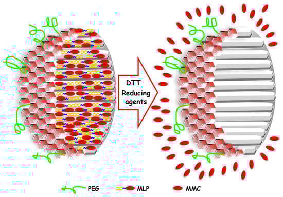 Schematic representation of a cross-section of pegylated MSNPs loaded with the prodrug MLP (left); in the presence of reducing agents present in tumor tissues, MMC is released through the cleavage of the disulfide groups (right).