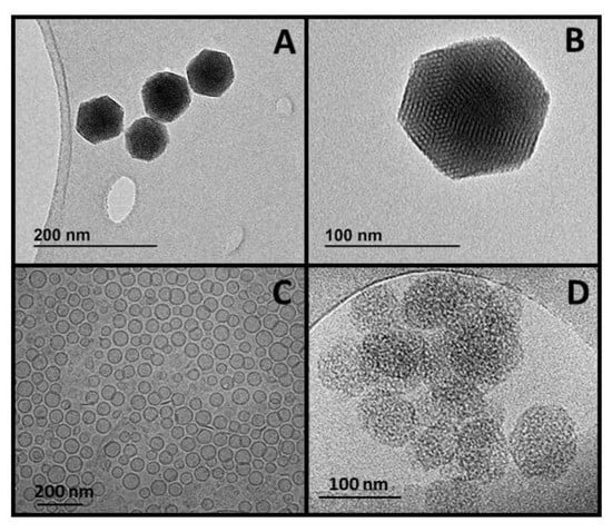 (A,B) Transmission electron microscopy (TEM) images of mesoporous silica nanoparticles (MSNPs). (C) Cryo-TEM image of Promitil (pegylated liposomes with MLP). (D) Cryo-TEM image MLP-loaded MSNP.