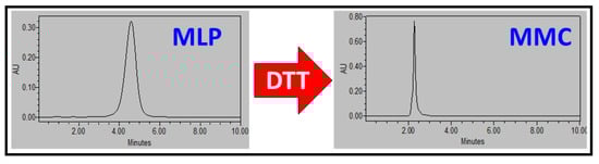 HPLC chromatograms showing the thiolytical conversion of MLP (prodrug, left) to MMC (active drug, right) after exposure to DTT 0.5 mM for 10 min at 37 °C.