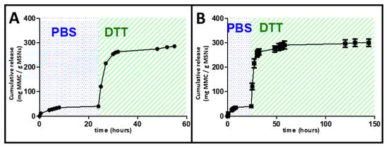 Kinetics of MMC release by DTT; MSNPs-PEG40 loaded with MLP were incubated with PBS at 37 °C for 24 h. Then, the release medium was changed to DTT 0.5 mM, and MCC release was obtained after 55 h of experiment (A) and 150 h of experiment (B).