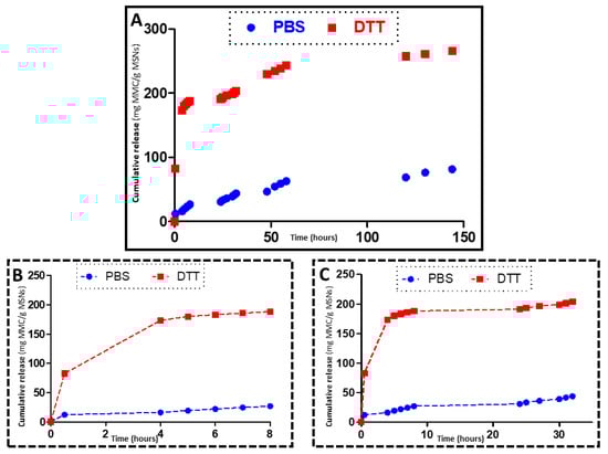 Kinetics of MMC release by DTT; MSNPs-PEG40 loaded with MLP were incubated with DTT (activation, red) or PBS (control, blue) at 37 °C, and samples were taken at different periods of time (A). Representative curves after 8 h of release experiment (B) and after 32 h of release experiments (C).
