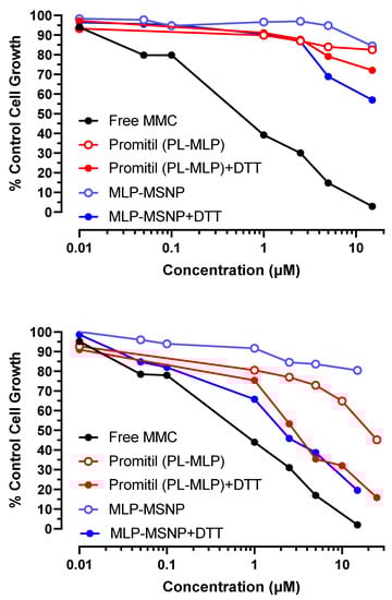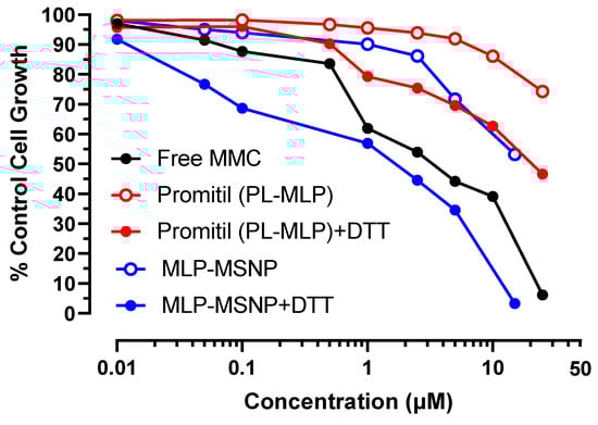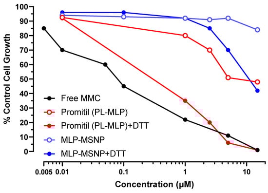 N87 cells were used in this experiment, where MSNPs loaded with MLP with and without being exposed to DTT were compared to liposomes loaded with MLP also with and without being exposed to DTT and free MMC as used as control, Figure 7 displays the cell growth respect to the control when increasing concentrations were added to the cells. Although greater cancer cell toxicity was found when MSNPs were exposed to DTT than to DTT-free medium, the cytotoxic effect was still less potent than when Promitil® was activated with DTT.