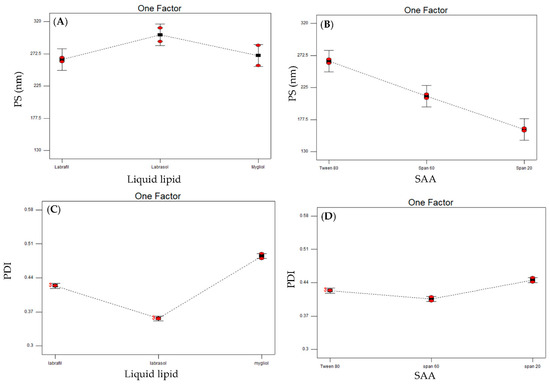 Line plots of the effect of the two significant studied variables: liquid lipid type on particle size (A), surfactant type on particle size (B), liquid lipid on polydispersity index (C) and surfactant type on polydispersity index (D).