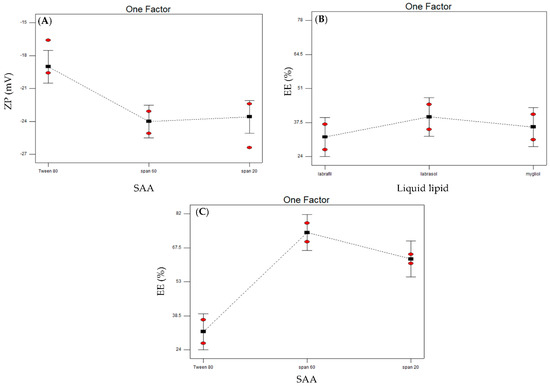 Line plots of the effect of the two significant studied variables: surfactant type on zeta potential (A), liquid lipid type on entrapment efficiency (B) and surfactant type on entrapment efficiency (C).