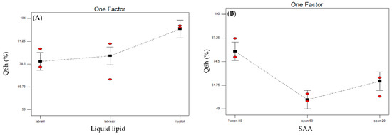 Charges acquired by the prepared NLCs were assessed utilizing the ZP term. The measured ZP values ranged from −17.9 (NLC3) to −24.4 (NLC7) (Table 2), indicating that some formulae have better stability (higher than 20) than other formulae (lower than 20) [43]. It is worth noting that all prepared NLCs developed negative ZP. This can be assigned to the presence of acidic groups in both the solid lipid (Compritol®) [71] and liquid lipids (oils) [72,73] used. The results were subjected to statistical analysis employing the main effects model with an adequate precision of 6.54 and a small gap between the adjusted R2 (0.5904) and the predicted R2 (0.3995) (Table 3). The model was found to be statistically significant (p < 0.005), with an insignificant lack of fit (p = 0.8729). Differentiating the main effects of the studied variables revealed that the liquid lipid type affected the measured ZP insignificantly (p ˃ 0.01), whereas the SAA type showed a significant effect on ZP (p < 0.001). Tween 80 showed higher ZP values in comparison to Spans (20 and 60) used (Figure 2A). These results can be explained regarding HLB values, where Hong et al. [74] believed that microemulsions prepared with HLB values above 11 have higher ZP in comparison to those prepared with lower HLB values (less than 10). This may be due to the adsorption of OH- species from the aqueous medium [75], in addition to the higher ability of Tween 80 to form hydrogen bonds between the polyoxyethylene group and OH−, resulting in the formation of oxonium ions [76].