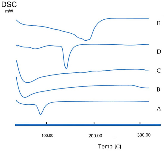 DSC thermograms are presented in Figure 5. All of the studied excipients, namely, Compritol®, Miglyol® and Span 20, showed their corresponding phase transition temperatures (Figure 5A–C). ZMP showed a melting point at 141 °C, indicating drug purity [16] (Figure 5D). The drug endothermic peak disappeared in NLC9 (Figure 5E), which suggests the incorporation of the drug in the prepared NLCs nanocarriers turning it into an amorphous state with no sharp endothermic peak but, rather, a melting range. In addition, a very broad peak was observed that was initiated at 40.24 °C and ended at 244.4 °C, with a peak maximum at 183.67 °C, indicating the interaction between the solid lipid (Compritol®), liquid lipid (Miglyol®) and SAA used (Span 20) [82].