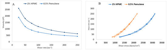 The viscosity of the two gels prepared (2% HPMC and 0.5% pemulen®) loaded with the candidate formula (NLC9) was evaluated using cone and plate viscometer. The freshly formulated gels were positioned in the cup of the viscometer using spindle 52 at 25 °C ± 1. The samples were continuously sheared at various rates.