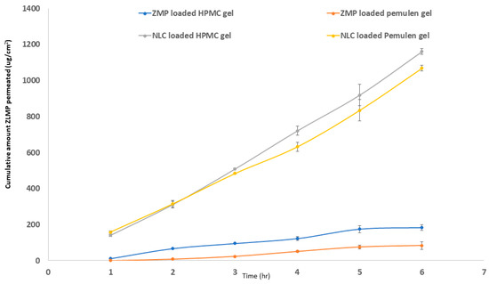 The USP dissolution apparatus II was used to investigate the ex vivo skin penetration and permeation of several NLC9-loaded gels. Fresh dorsal rat skin pieces with a permeation area of 3.14 cm2 and a receptor cell volume of 50 mL were fixed between the donor and receptor compartments. The fixed skin was stranded on a receptor compartment with the donor compartment facing the stratum corneum side. The receptor compartment was filled with 50 mL of phosphate buffer saline (PBS, pH 7.4) and held at 35 ± 0.5 °C under constant stirring at 75 rpm for 6 h. Aliquots of 2 mL were taken from the receptor compartment at 1, 2, 3, 4, 5 and 6 h and replaced with fresh medium. Determination of the amount of ZMP permeated was carried out adopting HPLC technique according to the method developed by Danavena et al. [53]. Their method was adapted and validated to our lab with a lower limit of quantitation at 60 µg/mL. A linear calibration curve was obtained between 60–100 µg/mL [54,55]. The ex vivo permeation of gels prepared containing the same amount of drug was carried out simultaneously for comparison reasons. Average cumulative amount of ZMP permeated through the skin surface per unit surface area (μg/cm2) was quantified and displayed as a function of time. The permeability (Pc), steady state flux (Jss; μg/cm2·h) and diffusion (D) coefficients were then computed as permeation parameters.