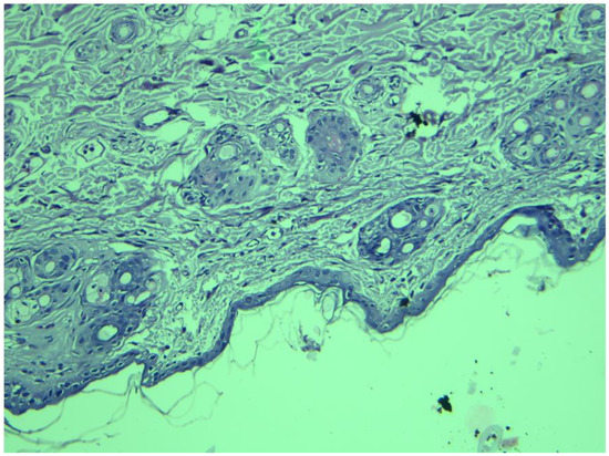 To assess the possible irritating impact of the developed formula, the optimum zolmitriptan NLCs loaded gel was smeared to the shaved dorsal skin of a rabbit in an area of 5 cm2 diameter for three consecutive days. The rabbit was then slaughtered, and skin sample was taken and preserved in formalin solution (10%). The sample was then desiccated with ethanol, fixed in paraffin and stained with hematoxylin and eosin. Five µm microtome sections were cut and inspected under a light microscope (National model 138, Guilin FT-OPTO Co., Ltd., Guilin, China) [32].