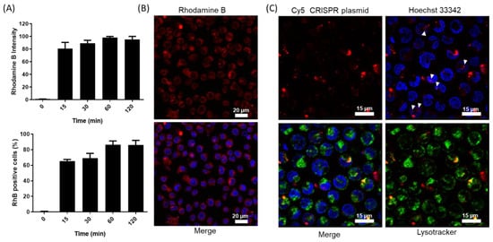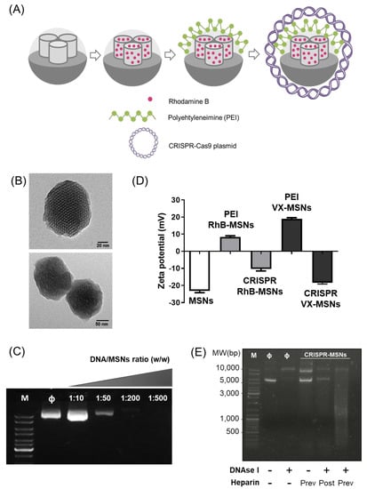 First, 2 mg of rhodamine B isothiocyanate (RBIT) were added with 20 µL of (3-aminopropyl)triethoxysilane (APTES) in 2 mL of anhydrous ethanol. The mixture was stirred in the dark at room temperature overnight. Then, 10 mg of MSNs were dispersed in 5 mL of anhydrous ethanol and 40 µL of the RBIT/APTES mixture were added. The suspension was left in the dark for 5.5 h at room temperature. Nanoparticles were washed and dried to yield RhB*-MSNs. The PEI-RhB*-MSNs and CRISPR-RhB*-MSNs were obtained following the synthetic procedure described in Section 2.3 and Section 2.6.