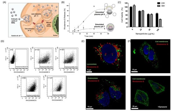 First, 1 mg of solid GFP38CRISPR-RhB-MSNs was suspended in 1 mL of simulated plasma at pH 7.0 or in 1 mL of simulated plasma at pH 5.0 []. Suspensions were stirred at 37 °C. At scheduled times (0, 15, 30, 60, and 90 min), an aliquot was obtained from each suspension and centrifuged to eliminate the solid. Rhodamine B delivery was followed by measuring fluorescence emission at 585 nm (λex = 525 nm).