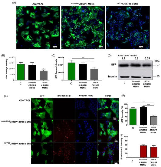Cells were cultured in 6-well plates at 250,000 cells/well for 24 h before transfection. Then, cells were incubated with the nanoparticles GFP38CRISPR-MSNs, GFP149CRISPR-MSNs, GFP178CRISPR-MSNs, and scrambledCRISPR-MSNs at 25 µg/mL for 4 h, and the media was replaced. After 48 h, cells were washed with PBS and the DNA marker Hoechst 33342 was added. Living cells were visualized in a confocal Leica TCS SP8 HyVolution II microscope. The quantification of GFP-associated fluorescence intensity for the different treatments was performed by analyzing the confocal images with the Image J software. The expression of the GFP levels in the U-2 OS-GFP cells was confirmed by Western blot analysis. Whole-cell extracts were obtained by lysing cells in a buffer containing 25 mM Tris-HCl, pH 7.4, 1 mM EDTA, 1 mM EGTA, and 1% SDS, plus protease and phosphatase inhibitors. The cells were mixed with the buffer by using a micropipette for a few minutes (2–3 min). The suspension was centrifuged at 14,000 rpm for 10 min, the supernatants were collected in new tubes, and the protein concentration was determined by using the Pierce BCA Protein Assay Kit (Thermo Fisher, 10741395). Lysates were resolved by SDS-PAGE, transferred to nitrocellulose membranes, blocked with 5% non-fat milk, washed with 0.1% Tween/PBS, and incubated overnight with a specific primary antibody. Primary and secondary antibodies were prepared in 5% non-fat milk. GFP (Santa Cruz Biotechnology, sc-9996, Heidelberg, Germany) antibody was prepared at 1:1000 dilution, and α-Tubulin (YL1/2) antibody (Abcam, ab6160, Cambridge, UK) at 1:3000 dilutions. Membranes were washed and incubated with the correspondent secondary antibody conjugated with horseradish peroxidase, anti-mouse IgG antibody (Abcam, ab205719), and anti-rat IgG antibody (Abcam, ab182931), respectively, and prepared at 1:3000 dilutions. Chemiluminescence was detected after Lumi-Light Western Blotting Substrate (Roche) incubation.