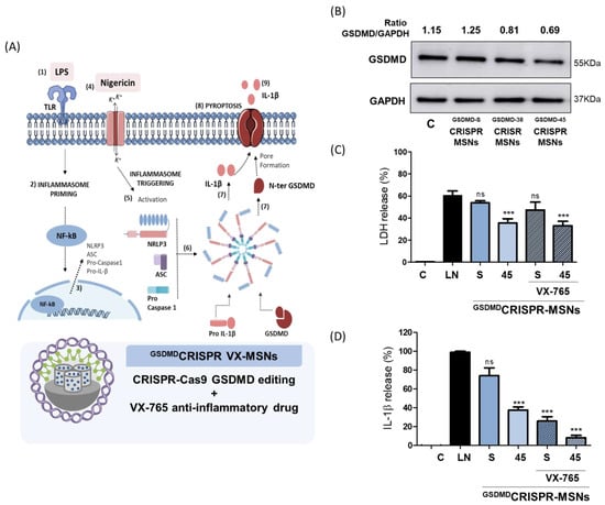 Likewise, we envisioned that MSNs could be excellent candidates for the dual delivery of CRISPR-Cas9 machinery and drugs to enhance current therapies against complex inflammatory disorders. The uncontrolled production of inflammatory mediators and an imbalance of inflammatory cells have been related to acute and chronic inflammatory diseases, such as injury infections, sepsis or arthritis, respiratory disorders, and cancer [,]. In most cases, current therapies are still based on the amelioration of inflammatory symptoms and are unable to ensure a complete cure [,,]. Bearing in mind the complexity of inflammation, new efforts still need to be made by blocking different inflammatory pathways. The inflammatory process can be divided into two main mechanisms: activation and release of inflammatory cytokines and activation of lytic cell death referred to as pyroptosis []. As previously mentioned, some anti-inflammatory therapies have limited success because they only act by inhibiting the activity of certain cytokines, such as VX-765, but not cell death by pyroptosis []. Recently, gasdermin D (GSDMD) has been described as a direct effector of pyroptosis and the deletion of the GSDMD gene with promising results for anti-inflammatory therapy [].