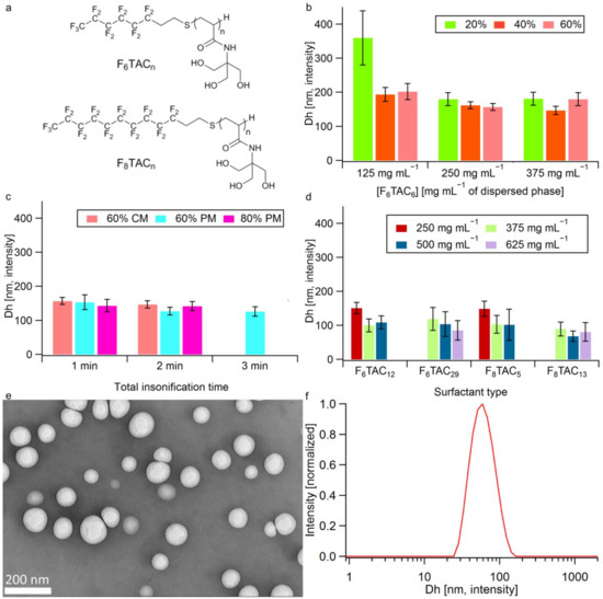 The optimization of US parameters was performed with F6TAC6 surfactant, specifically insonification duration, amplitude and mode (CM vs. PM). Figure 1b,c show that the droplet Dh tends to be inversely proportional to the F6TAC6 concentration and US amplitude reaches a plateau at 250 mg mL−1 (Figure 1b) and 60% (i.e., 450 W) (Figure 1c), respectively. Moreover, the PM (DC of 11.97% and pulse width of 8 s) provides smaller droplets compared to CM and the optimum insonification time is found to be 2 min, since larger Dh and no size improvements were observed at 1 min and 3 min, respectively (Figure 1c).