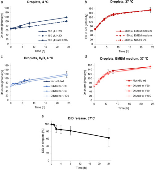Stability of nanoemulsions. (a,b) Changes in droplet Dh over time, after rehydration with various dispersing phases (water, NaCl 0.9%, complete cell culture medium (EMEM + 10% FCS)) and volumes, and stored at 4 °C (a) or 37 °C (b). (c,d) Impact of dilution on changes in droplet Dh over time after rehydration with water at 4 °C (c) or complete cell culture medium (EMEM + 10% FCS) at 37 °C (d). (e) DiD release from STE at 37 °C over time, HPLC dosage. The values are reported as mean ± SD (n = 3).