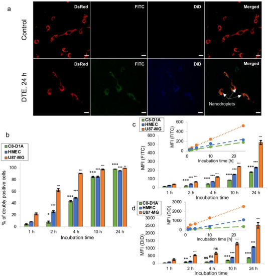 Cellular uptake of nanodroplets. (a) Confocal laser scanning microscopy imaging of U87-MG-transfected DsRed cells (red) untreated (control) or treated with DTE (green/blue, arrows) for 24 h. Scale bar = 20 µm. (b–d) Fluorescence-activated cell sorting analysis of U87-MG, HMEC-1 and C8-D1A cells treated with DTE for 1, 2, 4, 10 or 24 h. The values are expressed as mean ± SD (n = 3, *,° p < 0.05, **,•• p < 0.01, ***,°°°,••• p < 0.001, Student’s t-test). Insets represent linear regression of MFI versus incubation time. MFI, Mean Fluorescence Intensity.