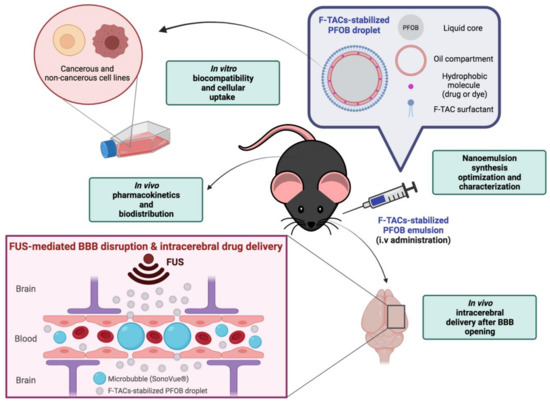 Schematic illustration of F-TAC-stabilized PFOB nanodroplets and the different steps of characterization performed for their development as suitable nanocarriers for brain drug delivery. Created with BioRender.com (accessed on 15 February 2022).