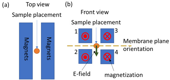 Experimental geometry. (a) Top view of the EPM array with a centrally positioned sample (orange circle). (b) Front view of the EPM array, showing four EPM assemblies with magnetizations directed along the length of each EPM assembly. The direction of the electric field is shown by an arrow, and a dotted line depicts the orientation of the transwell membrane (on which the Caco-2 cells are grown) for in vitro experiments. The EPM magnet assemblies are numbered 1 through 4.
