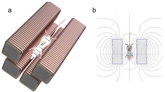 Murine experimental setup. (a) For in vivo experiments, a mouse was placed inside the four-magnet EPM array, with the length of the mouse oriented along the length of the EPM assemblies. (b) The EPM assemblies, shown as blue rectangles, generate magnetic fields, shown here as black lobe-shaped lines. The magnetic pulses generate electric fields (blue arrows) to which the mouse is exposed.