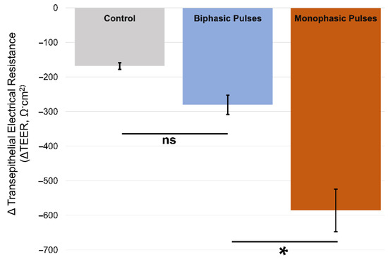 TEER measurement results. Samples exposed to monophasic electric field pulses demonstrate statistically relevant changes in TEER measurements. Here, ns indicates results which are not statistically significant, while * indicates statistical significance.