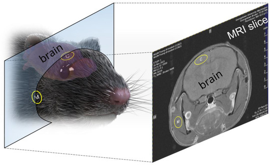 Mouse brain MRI for assessing Gadovist uptake. MRI slices collected of the mouse head were analyzed at two distinct locations, shown above (yellow circles). Gadovist uptake, as characterized by a change in signal intensity before and after EPM pulses, was measured in regions of the cortex (yellow circle with (C)) and regions of muscle (yellow circle with (M)) for comparison.