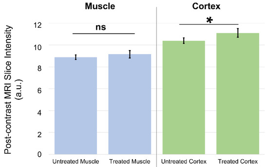 In vivo Gadovist uptake results for muscle and cortex. Comparison of MRI region-of-interest signal in muscle and brain cortex for untreated and treated mice. The muscle shows no statistically significant difference in post-contrast MRI intensity for untreated and treated animals. The cortex shows a statistically significant difference in post-contrast MRI intensity for untreated animals as compared with treated animals. Here, ns indicates results which are not statistically significant, while * indicates statistical significance.