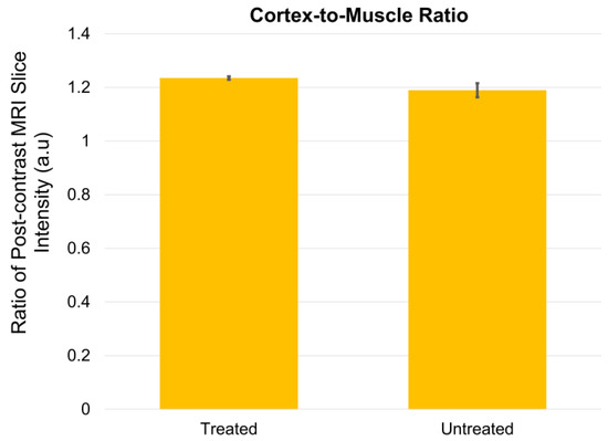 Comparing ratios for the treated and untreated animals, a cortex-to-muscle ratio was calculated for the treated and untreated groups (Figure 7). The ratio simply takes the post-contrast MRI slice intensities for the cortex and divides by the post-contrast slice intensities for the muscle, separately for treated and untreated animals.