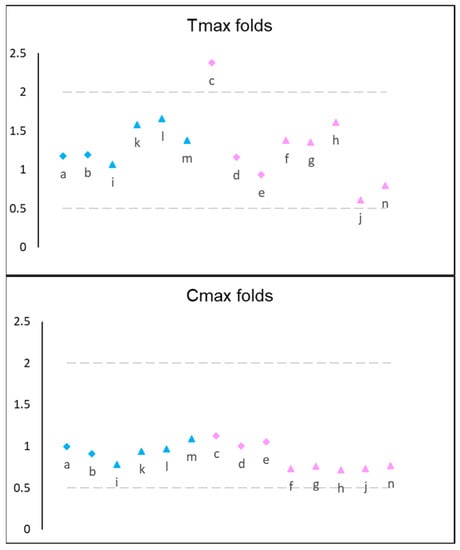 Plotted fold differences for simulated versus observed values. Diamonds indicate healthy volunteers, triangles—Parkinson’s patients, blue color—fasted state, pink color—fed state. Each symbol represents a fold value from each simulation included in Table 2. Latin letters indicate Simulation ID referenced in Table 2.