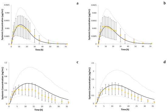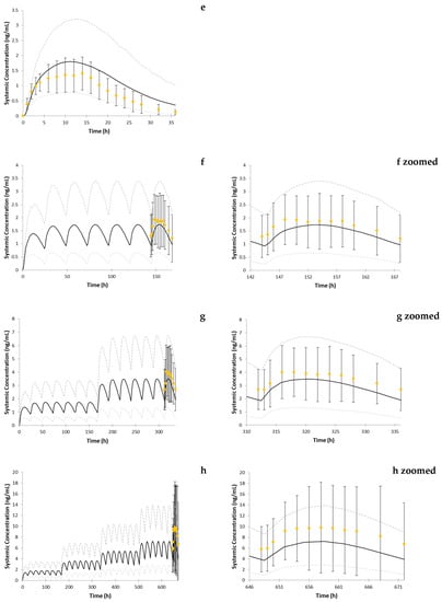 The visual checks are provided in Figure 3. Figure 3a–e represents single-dose studies whereas Figure 3f–n represents multiple-dose studies. The multiple-dose simulations are additionally zoomed in the timeframe where the observed data were available. Figure 4 illustrates the model performance when IV clearance was predicted based on interspecies scaling and used in the model as a whole value. The simulation results with the use of different dissolution profiles are provided in Figure 5. Results of trial simulations in geriatric population are presented in Figure 6.