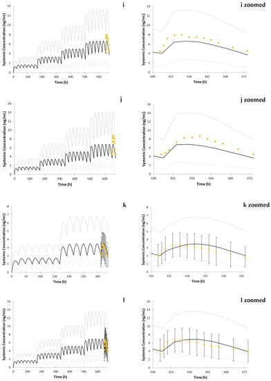 The simulations of the same studies with the use of the IVIVE approach are presented in Figure 3a (single-dose study) and Figure 3k (multiple-dose study). We hypothesized that the main reason that the IVIVE approach was more efficient lies in accounting for the inter-individual variability in the clearance-related physiological parameters. For this reason, for clearance prediction in the final PBPK model, an IVIVE approach was used.
