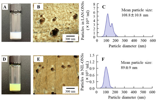 Images and particle sizes of ophthalmic formulations containing LAN and NIL nanoparticles. A and B: digital image (A) and AFM image (B) of LAN-ONSs. (C): particle size frequencies of LAN-ONSs. D and E: digital image (D) and AFM image (E) of NIL-ONSs. (F): particle size frequencies of NIL-ONSs. Bar, 300 nm. Both of the LAN-ONSs and NIL-ONSs appeared cloudy, and the mean particle sizes of the LAN-ONSs and NIL-ONSs were 108.8 nm and 89.0 nm, respectively.