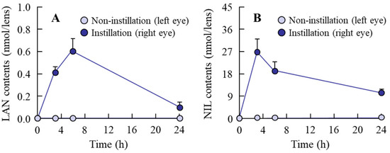 Changes of drug content in the lenses of rats instilled with LAN-ONSs (A) and NIL-ONSs (B). Twenty microliters of ophthalmic formulations (0.5% LAN or 0.6% NIL), shown in Table 1, were single-instilled into the right eye of 18-day-old rats (n = 8). Non-instillation, left eye of rats. Instillation, right eye of rats. The drugs (LAN or NIL) were detected in the lenses after a single instillation of LAN-ONSs or NIL-ONSs.
