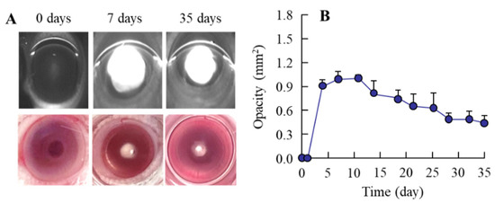 It is important to select appropriate animal models for the evaluation of anti-cataract effects. Many animal models of cataracts have been developed for drug screening. Selenite-induced cataract is an animal model of cataracts produced in suckling rat pups [21,22,23]. This model is useful for experimental studies regarding the biochemical mechanisms of cataract, as it presents several similarities to human cataracts; for example, ascorbate and glutathione concentrations are decreased, and there is suppression of mitosis, cytoskeletal loss, calpain-induced proteolysis, and decreased rate of epithelial cell differentiation [14,24]. Therefore, we used sodium-selenite-induced cataractic rats to evaluate the anti-cataract activity of the ophthalmic formulation proposed in this study. A single subcutaneous injection of sodium selenite led to severe nuclear opacity, and the selenite-induced cataracts in the rat model were observed from 4 days after injection of sodium selenite (Figure 3). Moreover, nuclear opacity was observed for at least 35 days after the injection of sodium selenite (Figure 3). Previous studies have also reported that the posterior subcapsular cataract, swollen fibers, and perinuclear refractile ring were observed at 1, 2–3, and 3 days after the injection, respectively. After that, severe bilateral nuclear cataracts are produced within 4–6 days. Thus, the timing of the onset of the cataracts and the persistence of nuclear cataracts in this study were consistent with previous reports [36].
