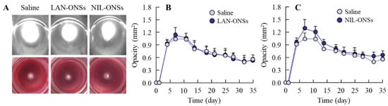 Figure 3 shows the change in lens opacification of rats after injection with sodium selenite. In the nucleus of the lens of both eyes, the onset of lens opacification began 3 days after a single injection with sodium selenite, and opacification was still observed at 35 days after the injection. The opacity level peaked at approximately 7 days after the injection of sodium selenite; after that, the opacity level gradually decreased with time. Figure 4 shows the effects of LAN-ONSs (A and B) and NIL-ONSs (A and C) on lens opacification in the selenite-induced cataractic rats. No improvement in lens opacification was observed in the rats instilled with LAN-ONSs and NIL-ONSs individually, as the opacity levels in the rats instilled with ophthalmic formulations were similar to those in the corresponding selenite-induced cataractic rats instilled with saline (saline). Next, we tested whether the combination of LAN-ONSs and NIL-ONSs attenuated the lens opacification caused by the injection of sodium selenite (Figure 5). The combination of LAN-ONSs and NIL-ONSs reduced the opacity levels in sodium-selenite-induced cataractic rats, with the opacity levels being up to 43% reduced in comparison with the saline group.