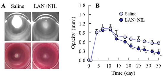 Effect of the combination of LAN-ONSs and NIL-ONSs on opacification in sodium-selenite-induced cataractic rats. (A): digital and Scheimpflug slit images of the sodium-selenite-induced cataractic rats repeatedly co-instilled with LAN-ONSs and NIL-ONSs. The images were measured at 35 days after the injection of sodium selenite. (B): change in opacity levels in the sodium-selenite-induced cataractic rats repeatedly co-instilled with LAN-ONSs and NIL-ONSs. Twenty microliters of ophthalmic formulations (0.5% LAN or 0.6% NIL), shown in Table 1, were instilled one time/day for 28 days. The start day and the end day of dosing were 7 and 35 days after injection of sodium selenite, respectively. Saline, sodium-selenite-induced cataractic rat repeatedly instilled with saline. LAN + NIL, sodium-selenite-induced cataractic rats repeatedly co-instilled with LAN-ONSs and NIL-ONSs (n = 7–12). The combination of LAN-ONSs and NIL-ONSs rescued the opacity levels in the sodium-selenite-induced cataractic rats. * p < 0.05 vs. saline for each category.