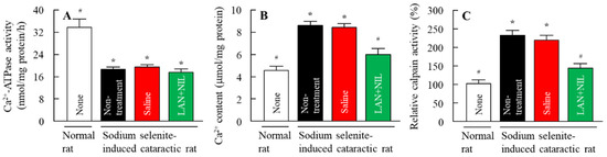 Changes in Ca2+–ATPase activity (A), Ca2+ contents (B), and calpain activity (C) in the lenses of normal and sodium-selenite-induced cataractic rats co-instilled with LAN-ONSs and NIL-ONSs. The instillation was performed at 7 days after the injection of sodium selenite, and the Ca2+–ATPase activity, Ca2+ contents, and calpain activity in lenses were measured 3 h after the instillation. None, normal rats. Non-treatment, sodium-selenite-induced cataractic rats. Saline, sodium-selenite-induced cataractic rats instilled with saline. LAN + NIL, sodium-selenite-induced cataractic rats co-instilled with LAN-ONSs and NIL-ONSs (n = 6–8). The enhanced Ca2+ content and calpain activity in the sodium-selenite-induced cataractic rats was significantly alleviated with the co-instillation of LAN-ONSs and NIL-ONSs. * p < 0.05, vs. none (normal rats) for each group. # p < 0.05, vs. saline for each group.